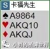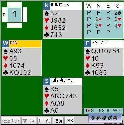 当这副牌在另室被重打时,前三家均不叫通过到坐南家的院长。“2♣。”