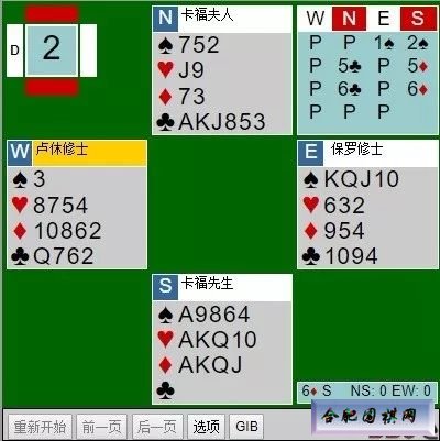 这副牌很快就被传到了另一间屋子,在那里卢休和保罗正对阵卡福先生,一位退休的税务检查官,和他的妻子。他们的竞叫过程如下: