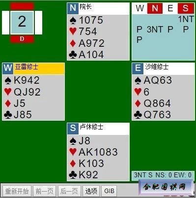 院长轻松地加成局,他不能仅仅叫2NT,这是不可设想的,因为他有8点,还有两张10,何况是亚雷修士首攻。