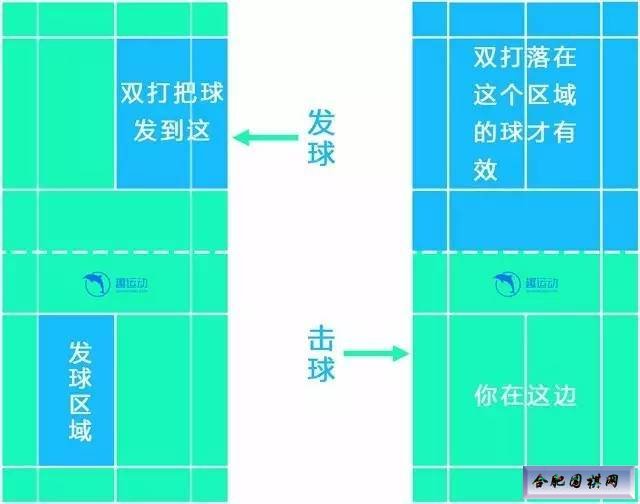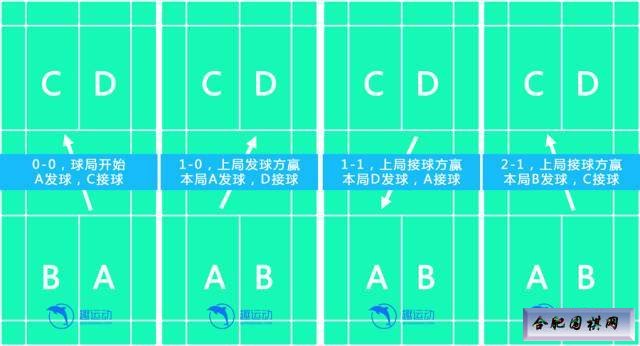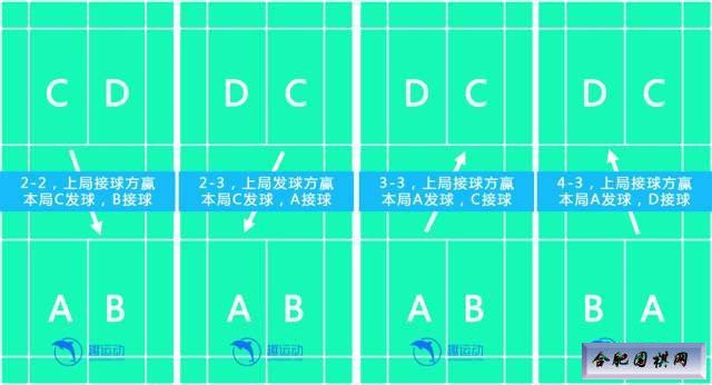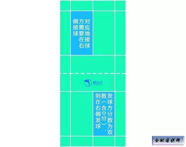 当发球方的分数为双数时(含0分),在右半场发球,否则在左半场发球;赢球的一方作为下一回合的发球方。 【双打】 相比单打而言,双打的规则复杂一些,不过也不难,可以用3句话总结: a. 分数为双数时在右半场发球,分数为单数时在左半场发球(跟单打一样); b. 赢球的一方作为下一回合的发球方; c. 发球方得分时两名队员才交换位置,其他情况位置不变。 以下附上两张图,更直观: