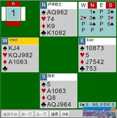 “我拿了头一墩♥, 用♠Q飞,”院长接着说。“然后用♠A垫掉一张♦,并用大王牌将吃一墩♠……”
