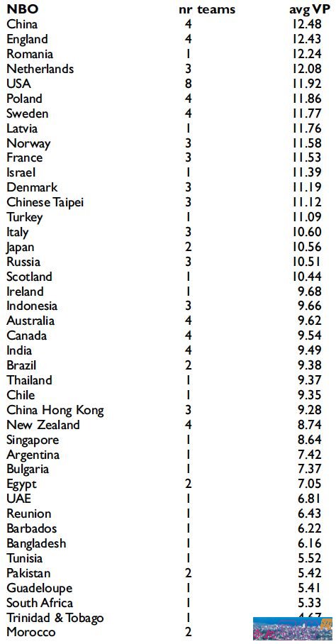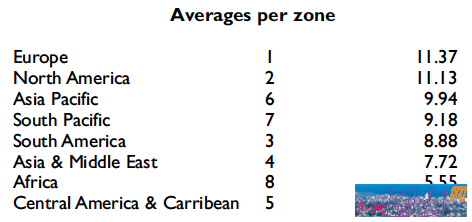 在另一项统计中,记录了世界桥联8个大区参赛队的总平均VP数,欧洲以11.37VP排在第一,北美11.13VP排在第二,亚太地区9.94VP名列第三。这印证了我之前提到的,欧洲区最强,亚太地区取代欧美之外其他地区成为最有竞争力的区域。这样的数据是否表明,排在最后的中北美加勒比地区和非洲区,是否应该把他们的名额让出来呢,否则会不会让世锦赛的成色下降。