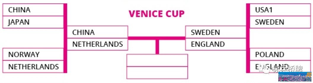 其他三大杯的比赛也不乏亮点,威尼斯杯中瑞典美女队决胜节逆转击败美国1队。德奥西杯丹麦队1分险胜法国。武汉杯罗马尼亚击败美国2队避免美国两队会师半决赛等等,都是经典比赛。 百慕大杯半决赛的对阵是:美国1队对波兰、挪威对荷兰。 威尼斯杯半决赛的对阵是:中国对荷兰、瑞典对英格兰。 德奥西杯半决赛的对阵是:美国2队对英格兰、丹麦对印度。 武汉杯半决赛的对阵是:英格兰对美国1队、俄罗斯对罗马尼亚。 半决赛仍然是96副牌分为6节,两天完成。 中国女队的半决赛对手荷兰队,是传统欧洲强队,荷兰队曾经在2000年的威尼斯杯上夺冠,但近年来女牌手流失严重,队伍不够整齐。上届威尼斯杯中国队首轮淘汰赛就击败荷兰,这次半决赛中国队胜面较大。赛前的主客队抽签表明,中国女队2、4、6节是主队她们有挑选对手的权利。 25日首节比赛将在VG/BBO1转播中国女队与荷兰的比赛,王建坚将在现场使用中文进行解说,在BBO看转播的诸位也可打开音频收听解说。