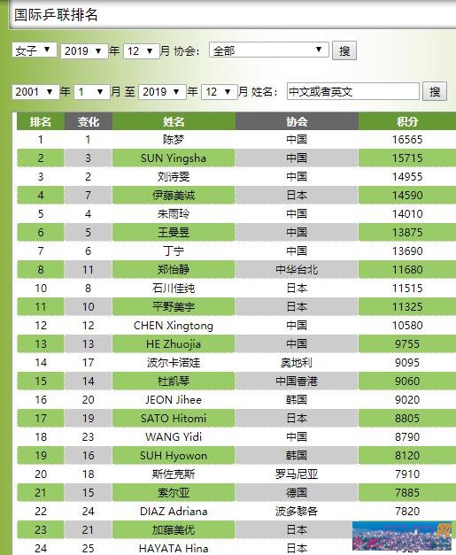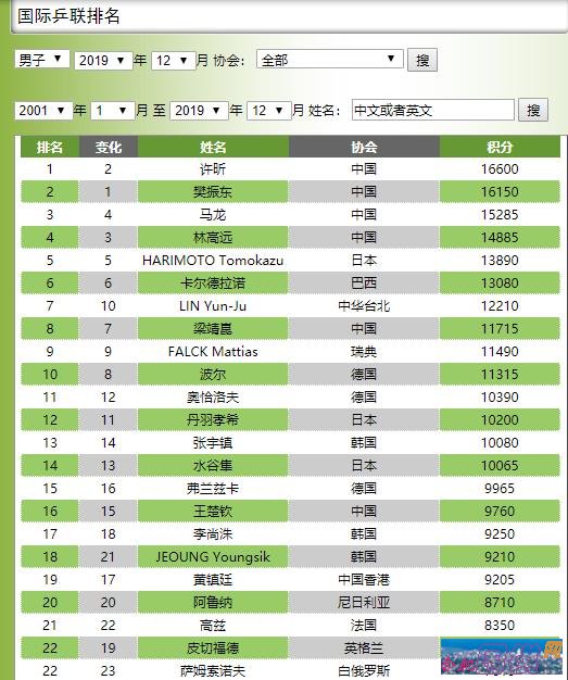 乒乓球排名201912