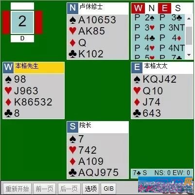 “是, 是,你出Q是必须的,”院长插嘴道:“本格(音似‘笨伯’——译注)先生赞许我们的防守,主要是针对早先我不上♦Q而言的。”