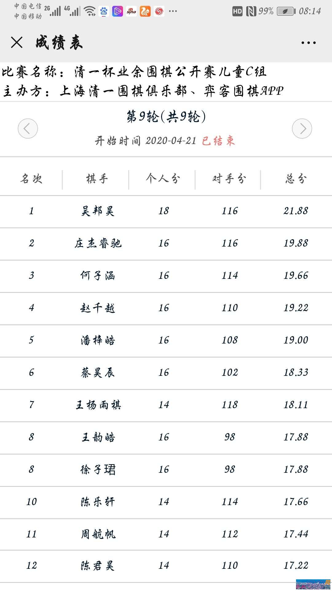 ![]() 左5何子涵业余5段,2018-2019连续两年“我是小棋手”全国少儿围棋赛冠军。 清一杯全国少儿围棋赛是目前国内举办的最大规模全国少儿围棋比赛,因为疫情影响,全部采用线上网棋进行。2011-2012年同组,何子涵在九天比赛中,八胜一负,成绩第三。 ![]() (责任编辑:大家) |
