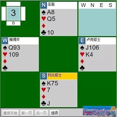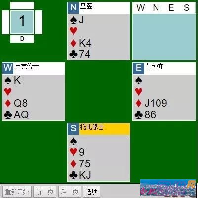 托比修士的加倍远非必然。不过他不愿让令人捉摸不定的巫医去判断、抉择。当托比修士连取两墩♦并用一♥脱手时,卢克修士从自己僧袍的袍袖上撵走一只凶恶的蚊子,然后沉思起来。