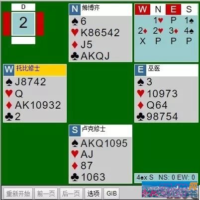 托比修士,奉院长指示,要让博茨万比部族人转到正统的埃坷制上来,开叫1♥。西做技术性加倍,巫医再加倍。托比修士回到2♥,他殊不知这在当地部落的“香蕉俱乐部”中是以前人们所乐用的表示相当强牌的叫品,因而巫医直接加到4♥。