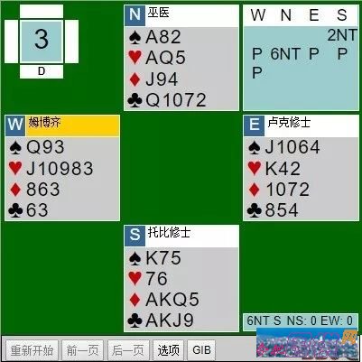 卢克修士出一顶张♠后,巫医摊下他的牌,评论道:“如果两手牌配得好,说不定有满贯。但对第一副牌我总是小心翼翼的。”