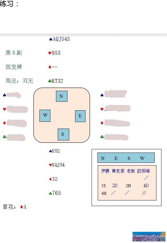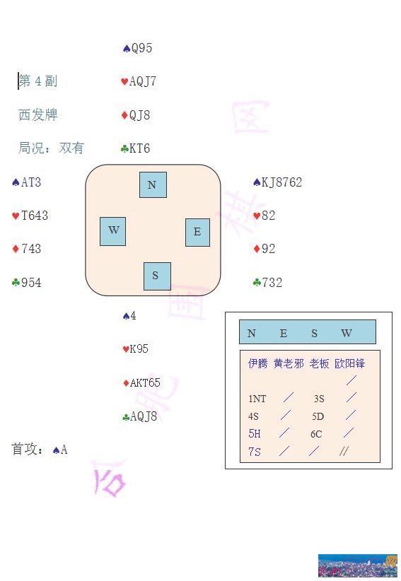 会打桥牌的人在当今社会还是得到大家认可的,如果在公众场合,有人说你会打桥牌,其他人还真的会高看你一眼的,觉得你的脑子肯定比别人要好使点,毕竟现在大多数中国人是不会打桥牌的。 学习的题目是桥牌成长录,更洽当一点说,是打桥牌中失误、犯错、后悔的记录,反过来说,桥牌是最符合墨菲定律的:不断犯错,并不断的成长。 理论上说,一张记分纸上,只要有分差,就说明有人打错了。打桥牌中,犯错的太多了,这是我们任何人都避免不了的。我想向大家介绍一些有典型意义的牌例,主要是为了防止我们在打牌中出现重大的失误。通过我们的牌例讲解,力图给你们留下一个印象深刻的记忆。 我这人平时给人的印象,就是一丝不苟、一本正经、木讷、古板,所以朋友们赠我一个雅号:老板。 下面这副牌例中坐北的就是伊腾,坐南的叫老板的就是我自己的雅名了。 ![]() 大家先看看这副牌,Q95。。。。。北家、南家的牌是可以打成6C或6D的。大多数南北得分应该是1370分。但这副牌被南北叫到7S,定约下6,反而让东西方得分600分。 这副牌打牌很简单,欧阳锋首攻SA,连拿6墩将牌,然后声称其他牌墩都不要了。 这副牌打结束以后,还有故事呢,我们南北方还没吱声,东西方倒先吵起来了。黄老邪站了起来,颤抖着手,哆哆嗦嗦的指着欧阳锋说:“你。你。你。有黑桃A也不加倍?”,欧阳锋斜了一眼:“那我问你,你六张黑桃怎么也不加倍?”黄老邪说:“那。那。那。他们要是跑到低花上我咋整啊?”欧阳锋使劲的翻了他一个白眼:“8梅花”。 伊腾此时挪了一下椅子,笑眯着眼,走到我的后面,轻声细语的问我:“老板,你的3S不是表示6张黑桃吗?难道你的意思是低花问叫?”我本来对她一肚子火,但看到她这么有礼貌,我觉得我还是忍一下吧,讲点中国男人的绅士风度。 针对桥牌这项运动,选手在比赛中相互合作相互包容更加重要,可我们很多人都做不到这点。这副牌,在伊腾叫7S时我真的是一腔怒火,但现在我平静了许多,针对伊腾的提问,我还是笑了笑,因为这对后面的合作至关重要。 我拿出中国桥牌协会《CCBA标准自然体系介绍》,找到相关内容,并向她解释道:“我们的叫牌卡使用的是中桥协的约定卡,3S在这里是代表54低花,黑桃单张。以前的中国自然叫牌法的确是象你刚才说的那样:3S代表6张黑桃,9点以上。”自己都感觉说话时脸还是有点僵硬,而且一本正经的,不苟言笑。但伊腾还是礼貌的向我道谢,然后打下一副牌。 1NT开叫后的其它应叫