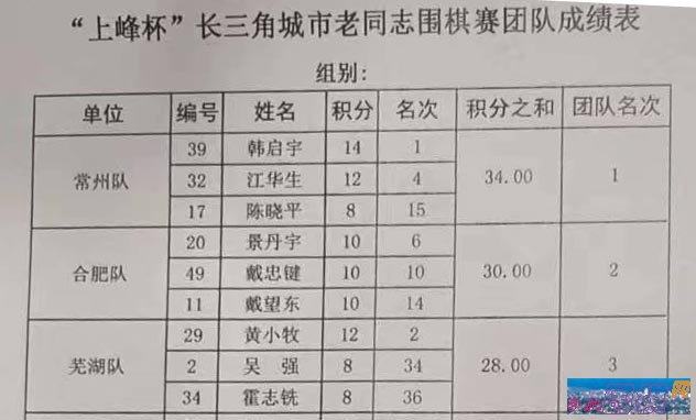 2023年6月26日,“上峰杯”长三角城市老同志围棋赛在铜陵市举行,常州队获团体第一名,由景丹宇、戴望东、戴忠建组成的合肥市代表队以总分30分的团体积分荣获第二名,芜湖队、上海松江队、宁波队、宣城队、安庆队、铜陵队获第三至第八名。![]() ![]() (责任编辑:小白) |