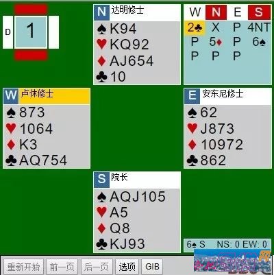 达明修士叫加倍后,院长考虑过罚放,但最终还是选择了4NT问牌。知道了有一个A在对方手中时,他叫6♠结束叫脾。