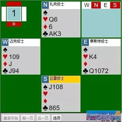 按照佩拉齐尼红衣主教的指导,亚雷修士上A,叫两轮王牌,接着出三轮♦,王牌上手,就出现了卷VII第673页所示的残局: